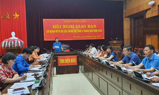 Chiều ngày 26/6, Thường trực Tỉnh ủy tổ chức Hội nghị giao ban khối cơ quan MTTQ và các đoàn thể tỉnh 6 tháng đầu năm 2020. Đồng chí Lò Văn Muôn, Phó Bí thư Thường trực Tỉnh ủy, Chủ tịch HĐND tỉnh chủ trì hội nghị. Dự hội nghị có các đồng chí: Lê Thành Đô, UVBTVTU, Phó Chủ tịch Thường trực UBND tỉnh; đại diện một số ban, ngành, lãnh đạo Ủy ban MTTQ và các đoàn thể tỉnh.