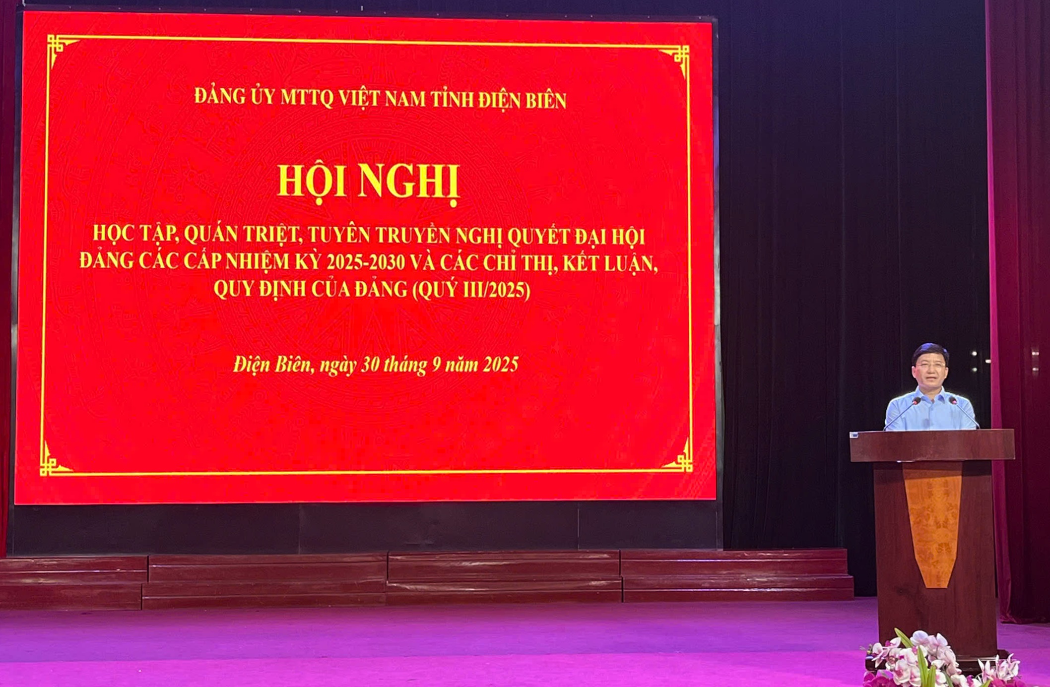 Sáng ngày 30/9/2025, Đảng ủy MTTQ Việt Nam tỉnh tổ chức Hội nghị học tập, quán triệt, tuyên truyền Nghị quyết Đại hội Đảng các cấp nhiệm kỳ 2025–2030 và các chỉ thị, kết luận, quy định mới của Đảng. Dự Hội nghị có đồng chí Mùa A Vảng, Ủy viên dự khuyết Ban Chấp hành Trung ương Đảng, Ủy viên Ban Thường vụ Tỉnh ủy, Bí thư Đảng ủy, Chủ tịch Ủy ban MTTQ Việt Nam tỉnh; các đồng chí trong Ban Chấp hành, Ban Thường vụ Đảng ủy cùng toàn thể đảng viên thuộc Đảng bộ.