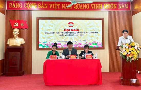 Chiều ngày 31/12, Ủy ban Mặt trận Tổ quốc Việt Nam xã Thanh An tổ chức Hội nghị lần thứ III, khóa I, nhiệm kỳ 2025 – 2030 nhằm tổng kết công tác Mặt trận năm 2025, đề ra mục tiêu và thống nhất chương trình hành động năm 2026. Dự và chỉ đạo Hội nghị có đồng chí Hạng A Giàng – Ủy viên Ủy ban MTTQ Việt Nam tỉnh, Phó Trưởng ban Thường trực Ban Tổ chức – Kiểm tra Ủy ban MTTQ Việt Nam tỉnh Điện Biên; đồng chí Trương Thế Dũng – Phó Trưởng ban Giám sát và Phản biện xã hội Ủy ban MTTQ Việt Nam tỉnh; đồng chí Hoàng Hữu Chình – Phó Bí thư Thường trực Đảng ủy xã; đồng chí Lò Văn Thành – Phó Chủ tịch UBND xã.