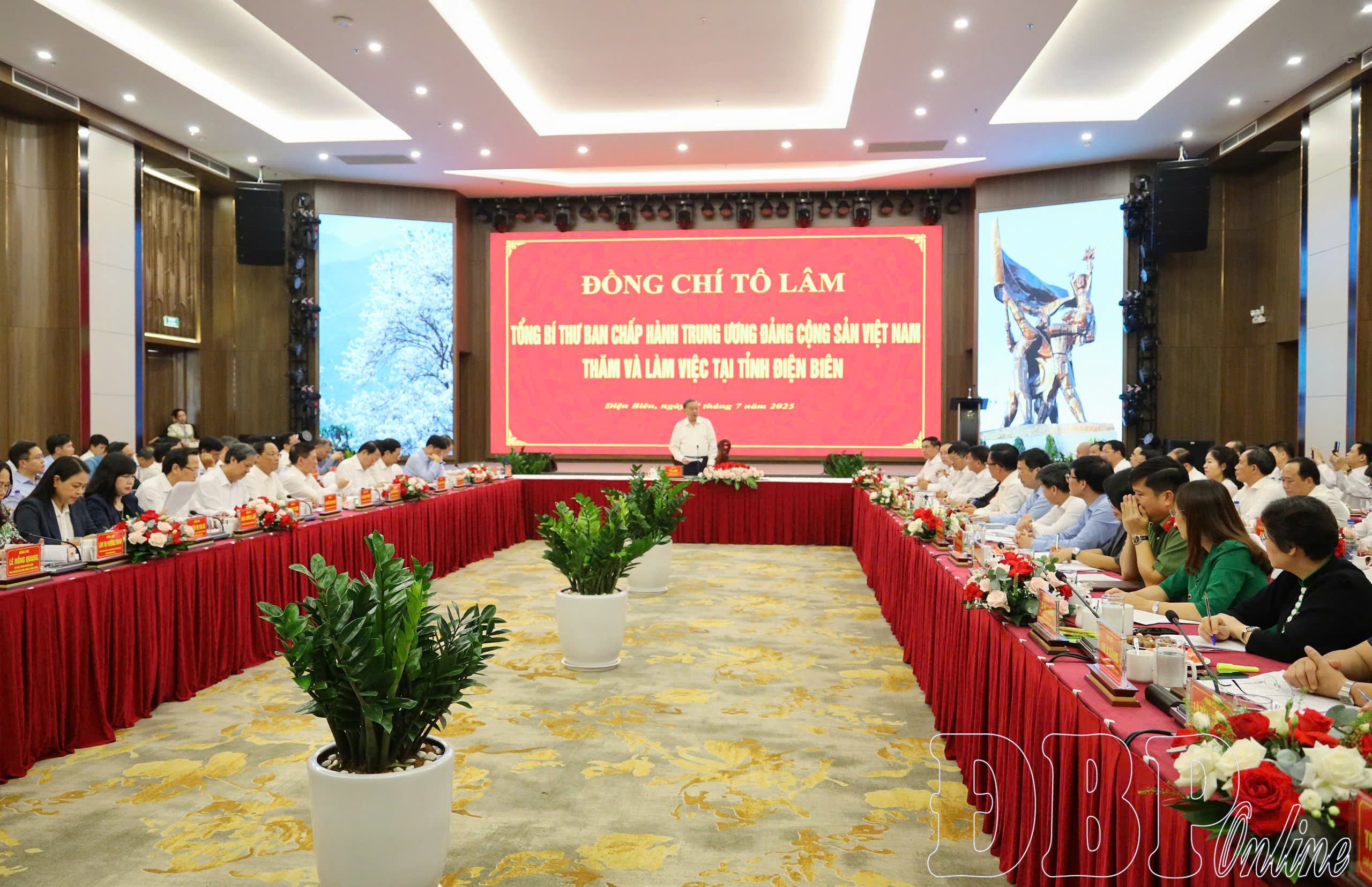 ĐBP - Chiều 27/7, đồng chí Tô Lâm, Tổng Bí thư Ban Chấp hành Trung ương Đảng và đoàn đại biểu lãnh đạo Đảng, Nhà nước, Chính phủ đã có buổi làm việc với cán bộ chủ chốt tỉnh Điện Biên về thực hiện nhiệm vụ phát triển kinh tế - xã hội, đảm bảo quốc phòng - an ninh, an sinh xã hội trên địa bàn tỉnh.